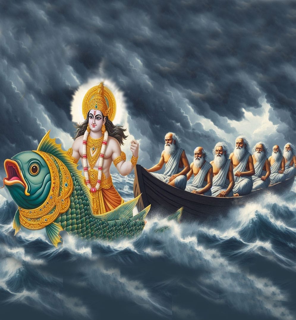 - At the time of the dainandin pralaya, Lord Matsya appeared to save the seven sages. For the entire duration of the pralaya, He pulled their boat through the pralaya water. He protected them and imparted divine knowledge to them.